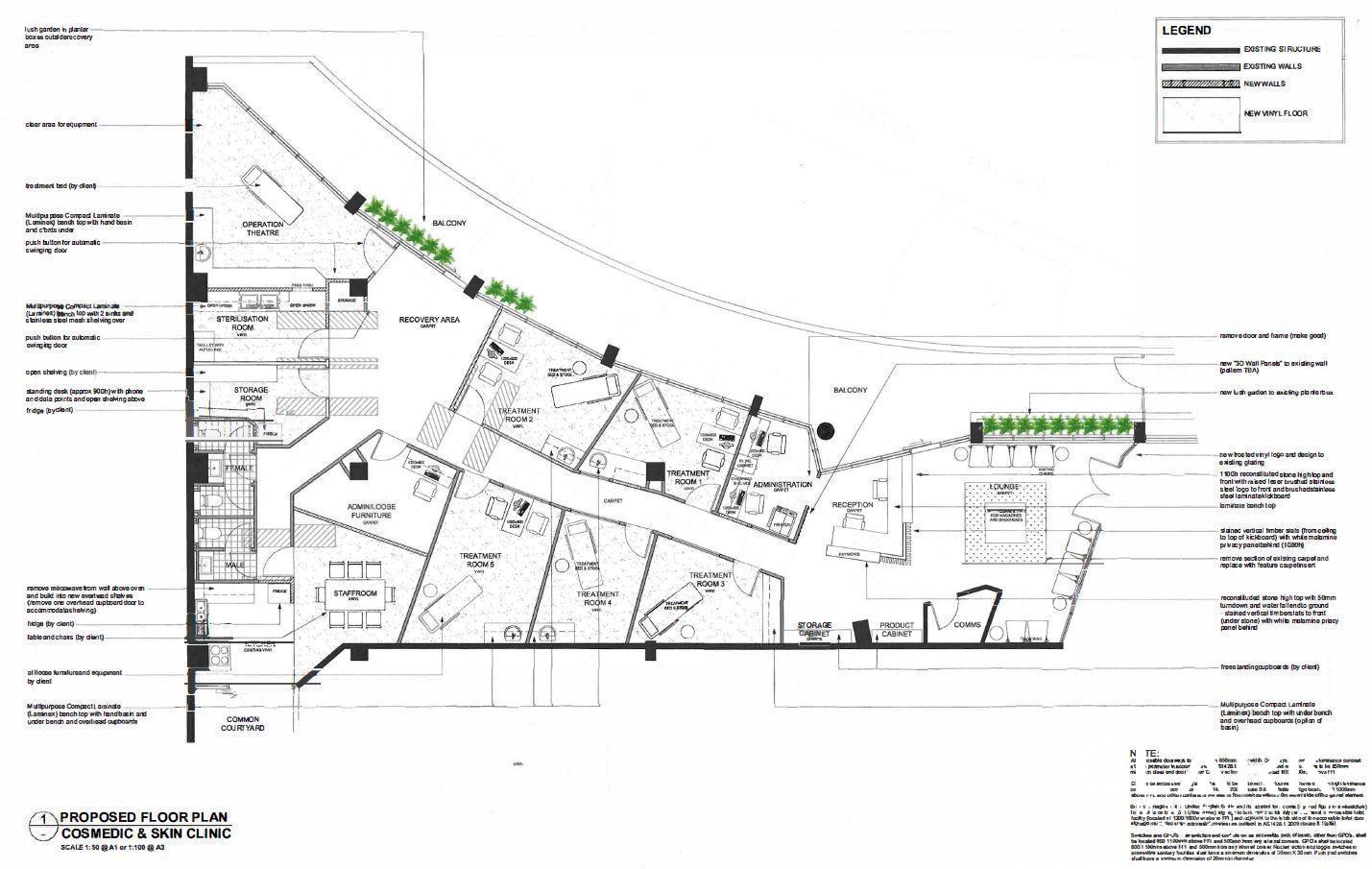 • Large reception and waiting room, five (5) treatment rooms, operation theatre, recovery area, two (2) administration rooms, sterilisation room, storage room, staffroom and kitchen, male and female toilets, private balcony