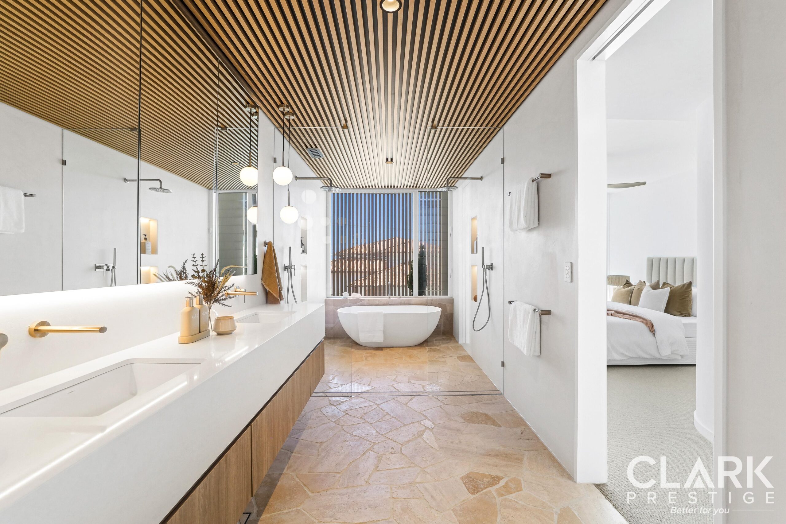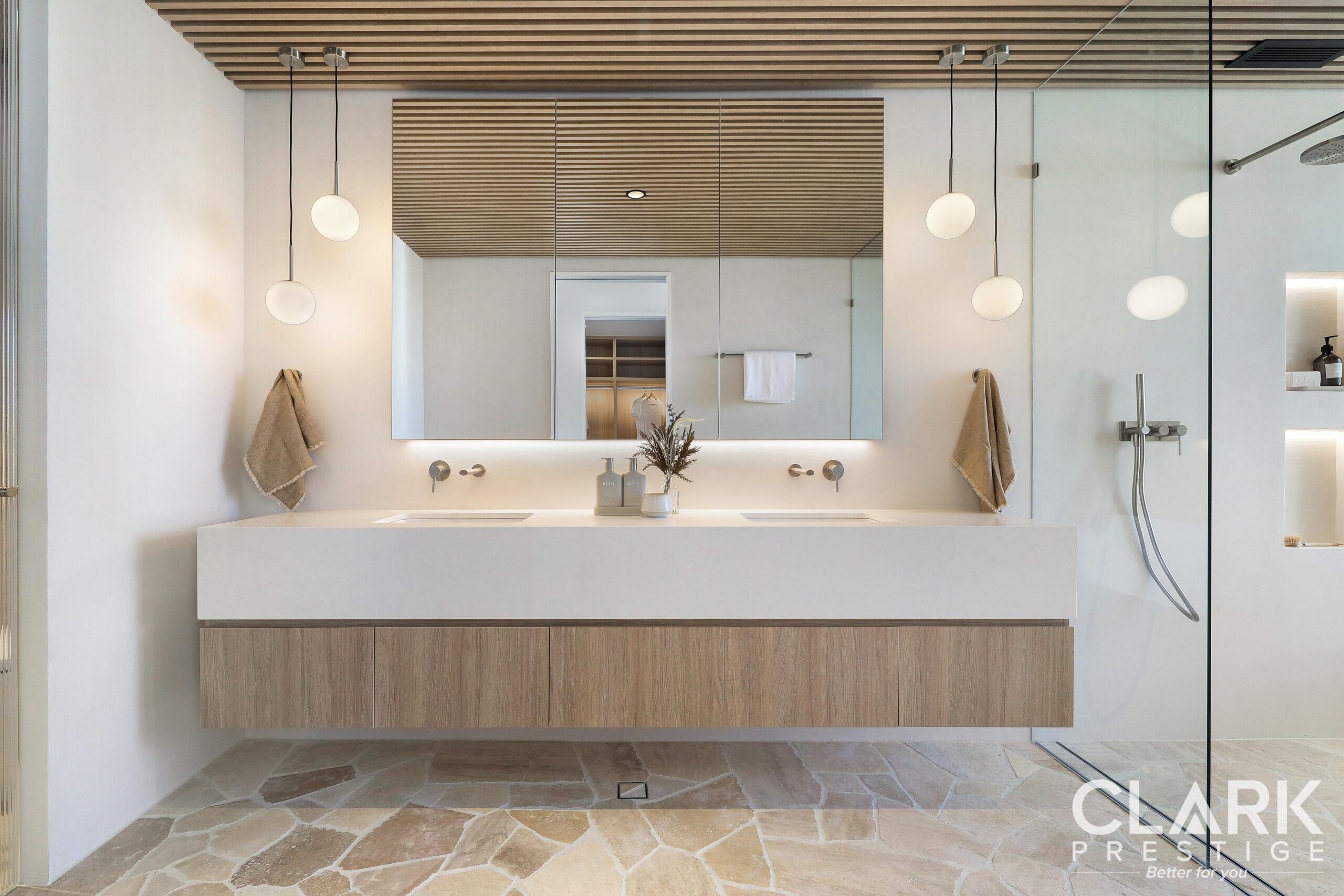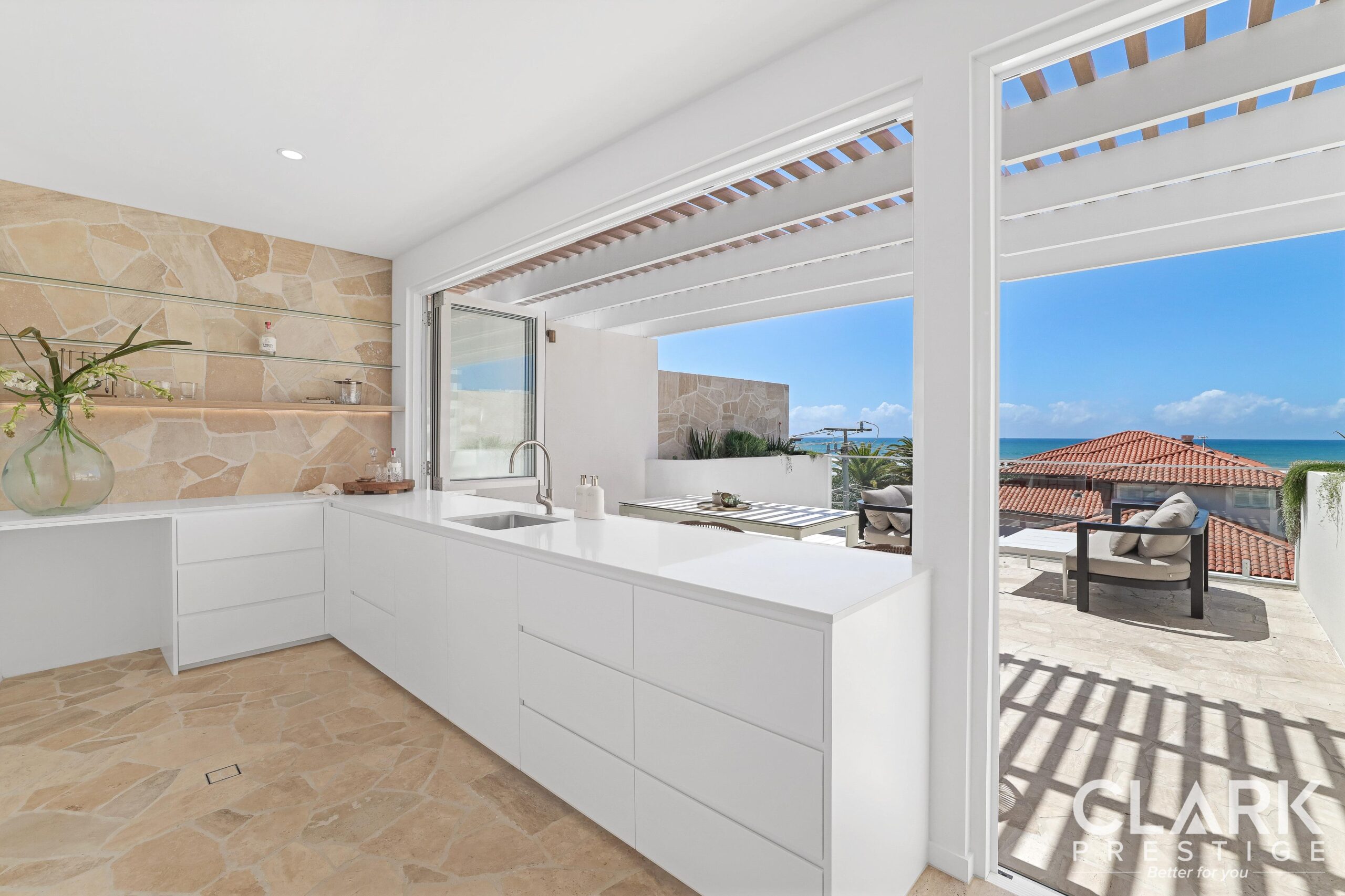 • Natural stones and coastal finishes throughout
